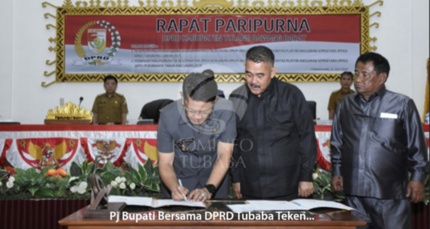Penjabat (Pj) Bupati Tulang Bawang Barat (Tubaba) Drs. M.Firsada, bersama Pimpinan DPRD Tubaba lakukan penandatanganan nota kesepakatan (MoU) KUA-PPAS Tahun Anggaran (TA) 2025 dan Kesepakatan Perubahan KUA-PPAS Tahun Anggaran 2024 Kabupaten Tubaba.Pada kesempatan tersebut, M.Firsada sampaikan ucapan terima kasih kepada seluruh pimpinan dan anggota DPRD Kabupaten Tubaba yang telah bersama-sama melakukan pembahasan dalam rangkaian proses penyusunan dari awal sampai dengan ditandatanganinya nota kesepakatan KUA-PPAS TA. 2025 dan Perubahan KUA-PPAS TA. 2024 Kabupaten Tubaba.”KUA-PPAS Tahun Anggaran 2025 masih menggunakan asumi-asumsi nilai alokasi anggaran tahun sebelumnya sembari menunggu terbitnya rincian Dana Transfer ke Daerah dan Dana Desa Tahun Anggaran 2025 yang kita harapkan adanya peningkatan nilai alokasi transfer dari tahun anggaran sebelumnya sehingga pemenuhan Belanja Wajib dan Pelayanan Publik di Kabupaten Tubaba dapat berjalan optimal.,” ujarnya.Sedangkan untuk perubahan KUA-PPAS TA. 2024 memuat penyesuaian nilai alokasi pendapatan, belanja dan pembiayaan daerah berdasarkan perkembangan capaian realisasi pada semester I pendapatan dan belanja daerah serta mempertimbangkan perkembangan ekonomi makro di Kabupaten Tubaba.”Dengan ditandatanganinya Nota Kesepakatan KUA-PPAS TA. 2025 dan Perubahan KUA-PPAS TA. 2024 Kabupaten Tubaba ini, akan menjadi dasar dalam hal penyusunan rancangan Peraturan Daerah tentang APBD Kabupaten Tubaba TA. 2025 dan rancangan Peraturan Daerah tentang Perubahan APBD Kabupaten Tubaba TA. 2024 yang akan disampaikan dalam waktu dekat. Semoga dengan nota kesepakatan ini menjadi awal yang baik dalam membawa kemajuan dan kesejahteraan bagi masyarakat Kabupaten Tubaba,” pungkasnya.Paripurna tersebut dihadiri oleh Jajaran Forkopimda, Staff Ahli Bupati, Para Kepala OPD dan Camat se-Kabupaten Tubaba.(ADV)