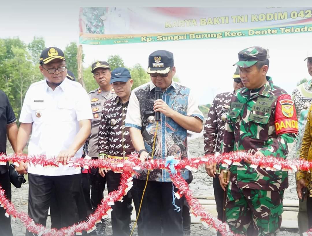 MEG,Tulang Bawang – Pj Bupati Tulang Bawang Ir. Ferli Yuledi.,SP.,MM.,MT di dampingi oleh Forkopimda Kab. Tuba, Pj. Sekdakab. Tuba, Asisten Bidang Pemerintahan & Kesra, Kasat Pol PP, Ka. BPKAD, Ka. DPMPKK, Ka. Dinas Sosial, Ka Diskominfo, Ka. Dinas Perikanan, Kalak BPBD, Camat Dente Teladas Meresmikan Pembangunan Jalan “Karya Bakti” yang terletak di Kampung Sungai Burung, Dente Teladas .