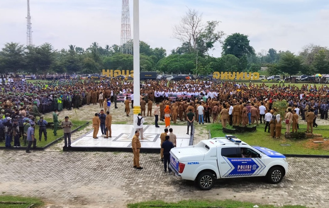 MEG,Lampung Tengah – Jajaran Polres Lampung Tengah, Polda Lampung mengamankan aksi unjuk rasa damai yang dilakukan oleh solidaritas Asosiasi Pemerintah Desa Seluruh Indonesia (APDESI) didampingi Organisasi Masyarakat (Ormas) Gerakan Rakyat Indonesia Bersatu (GRIB) Jaya di Lapangan Merdeka Gunung Sugih, pada Senin (25/11/24) pagi.