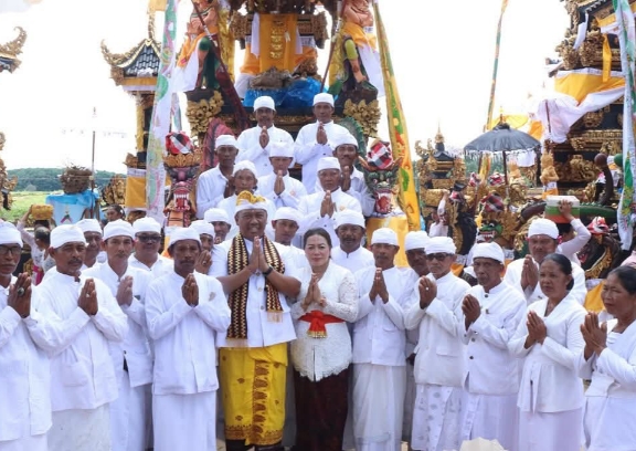 harianexposegelobal.com:Wakil Bupati Kabupaten Lampung Tengah, I Komang Koheri S.E menghadiri acara adat Karye Ngulap Ngambe serta Meresmikan Pura Ulun Danu bertempat Tirta gangga desa adat pakraman Swastika Buana, Kecamatan Seputih Banyak, Jum’at,(14/03/2025).