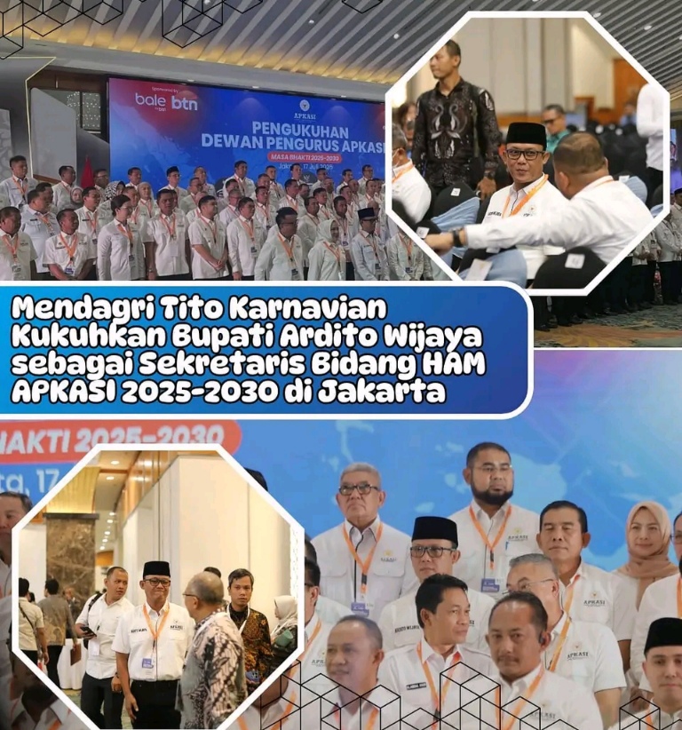 Bupati Lampung Tengah, Ardito Wijaya resmi dikukuhkan sebagai Sekretaris Bidang Hak Asasi Manusia (HAM) Asosiasi Pemerintah Kabupaten Seluruh Indonesia (APKASI) yang dikukuhkan langsung oleh Menteri Dalam Negeri Republik Indonesia, Tito Karnavian, pada Kamis (17/7/2025), di Hotel Grand Sahid Jaya, Jakarta Pusat.
